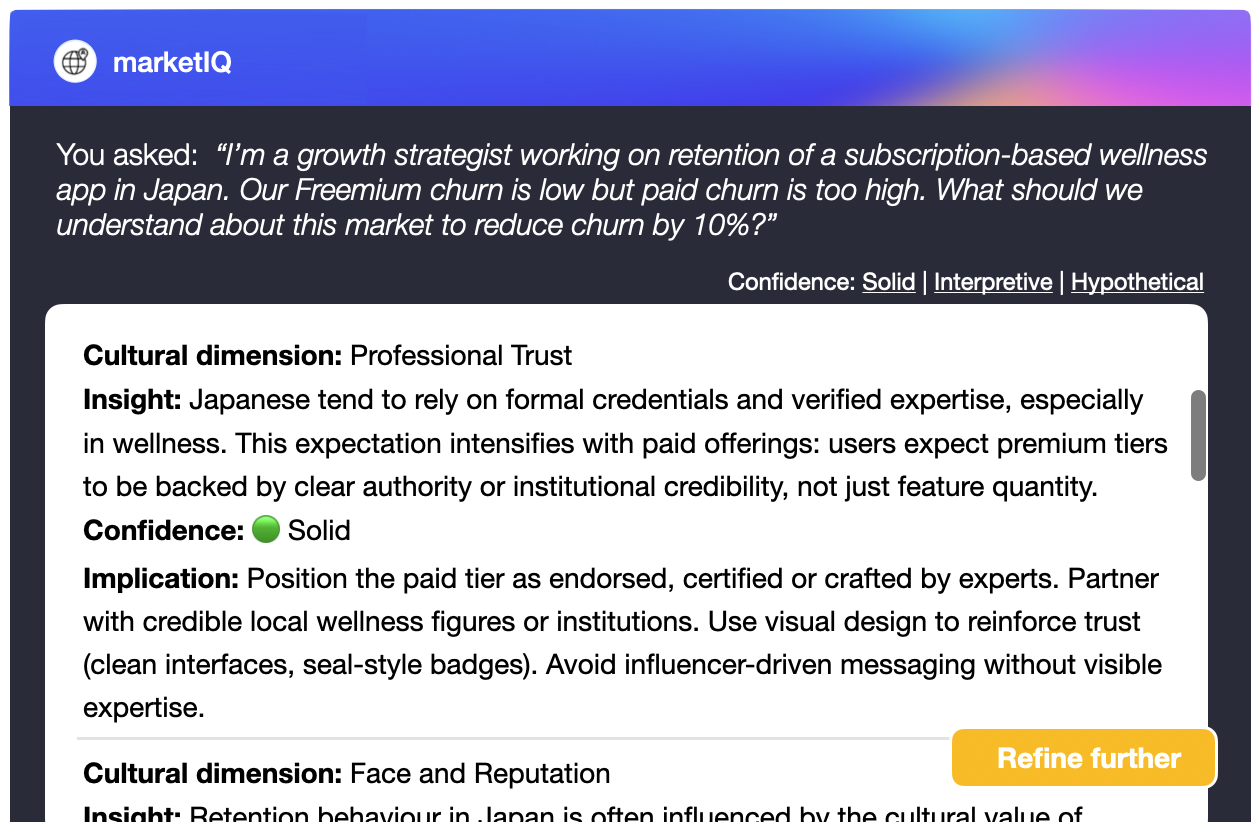 An AI-powered cultural intelligence platform that helps global teams explore the real-world context behind behaviours and decisions - reducing risk and unlocking growth when entering or scaling in new markets.